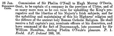 Commission of Sir Phelim O’Neall to Hugh Murray O’Devin, Gent., to be captain of a company in the province of Ulster, and of so many more men as he can raise for upholding the King’s prerogative and the liberties of his Majesty’s Irish subjects, and for the upholding and maintaining of this his Highness’s religion an the defence of the ancient holy Roman Catholic Religion. He shall receive a full captain’s pay, nominate officers at his discretion, and have command of the fort of Dunemanagh, late possessed by Sir William Hamilton, during Phelim O’Neale’s pleasure.