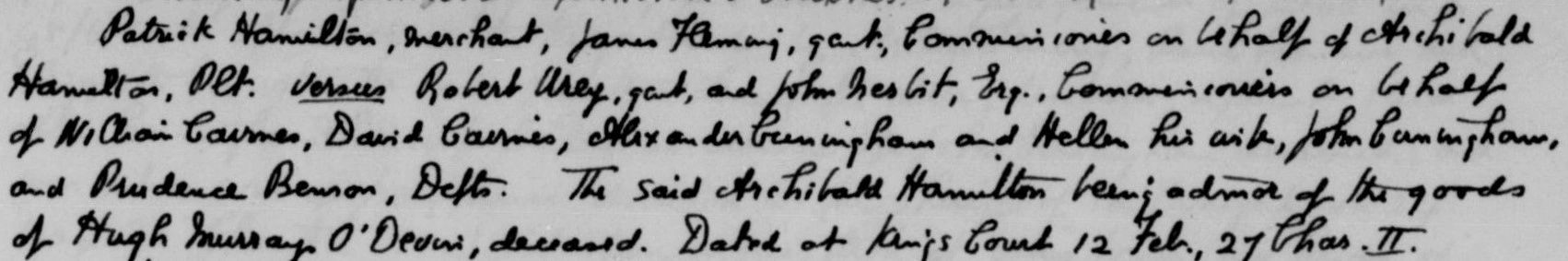 Patrick Hamilton, merchant, James Fleming, gent., Commissioners on behalf of Archibald Hamilton, Plaintiff, versus Robert Wrey, gent, and John Nesbit, Esq., Commissioners on behalf of William Cairnes, David Cairnes, Alexander Cunningham and Hellen his wife, John Cunningham, and Prudence Benson, Defendants. The said Archibald Hamilton being administrator of the goods of High Murray O’Devin, deceased. Dated at King’s Court 12 Feb., 27 Chas. II.